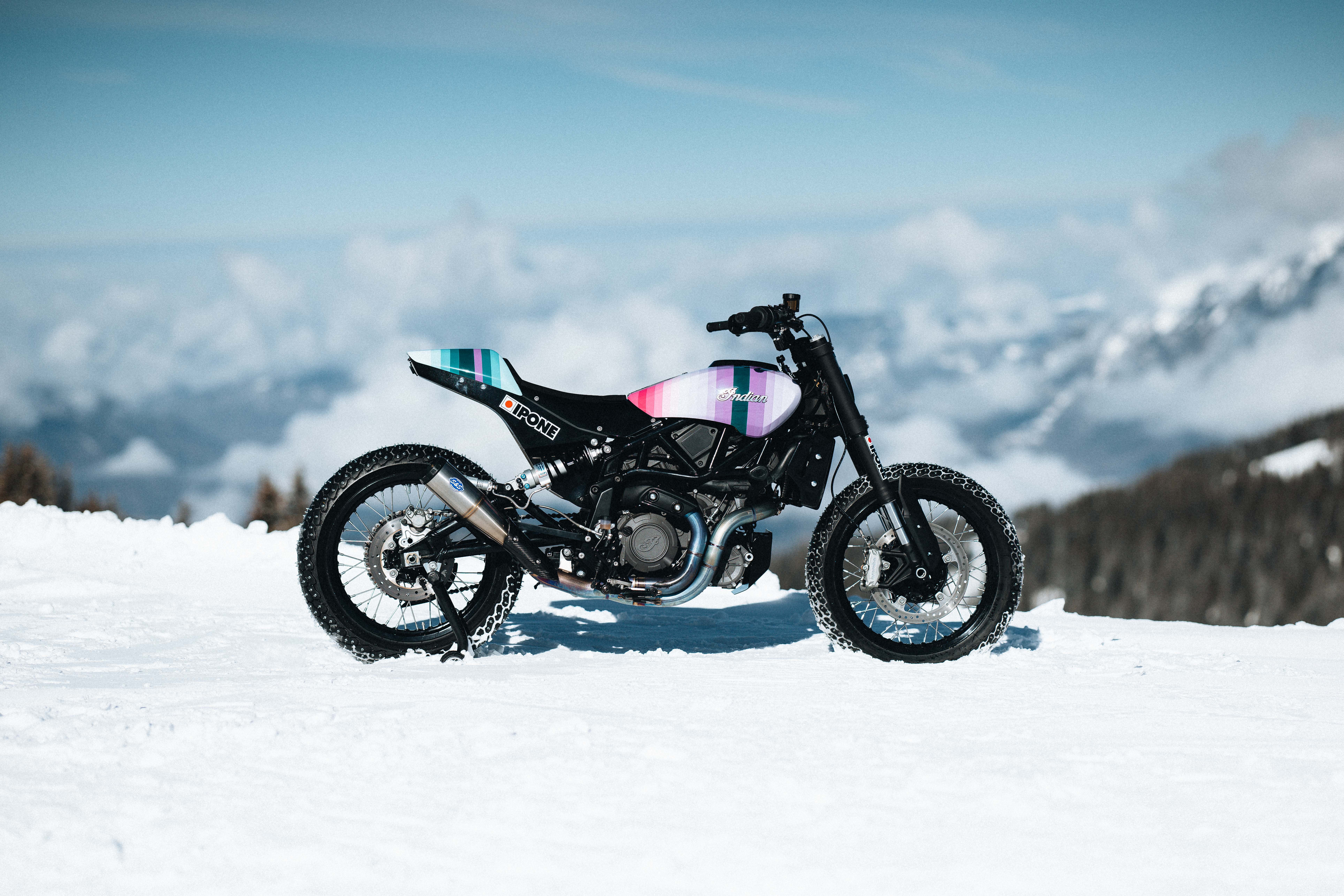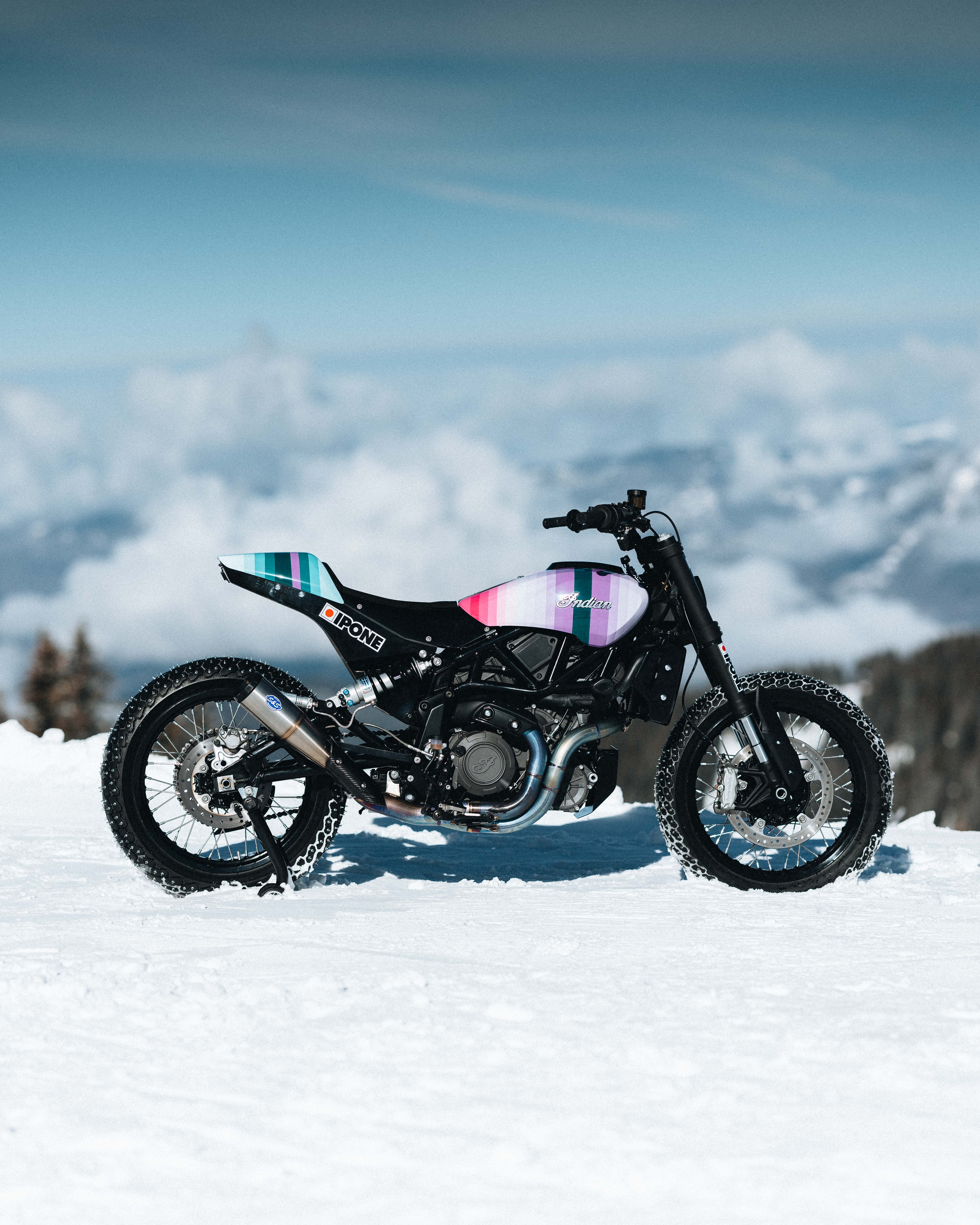 Dans sa nature sauvage et son blanc polaire, le calme laisse place à l’Indian FTR préparée par SLCDR pour agripper la neige grâce à ses pneus cloutés de 7mm. Un contraste percutant entre la neige et les couleurs pop de la moto.